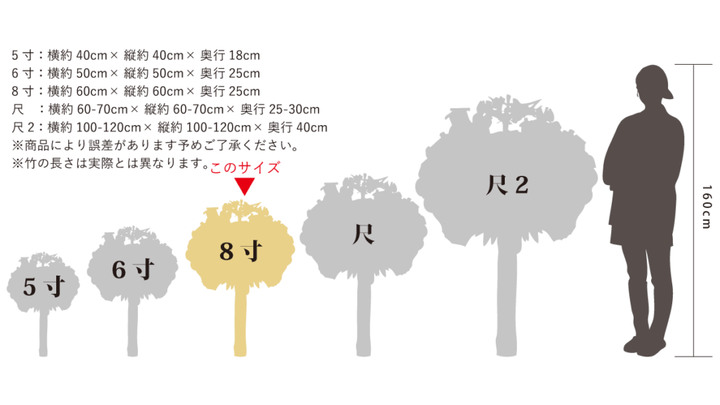 | 注意事項 | ※手作りのため、数センチ程度の誤差が生じる場合がございます。 ※サイズは竹を除く本体部分のサイズとなります。 ※竹がついた状態でお届けいたします。 ※デザインやパーツは異なる場合がございます。 |