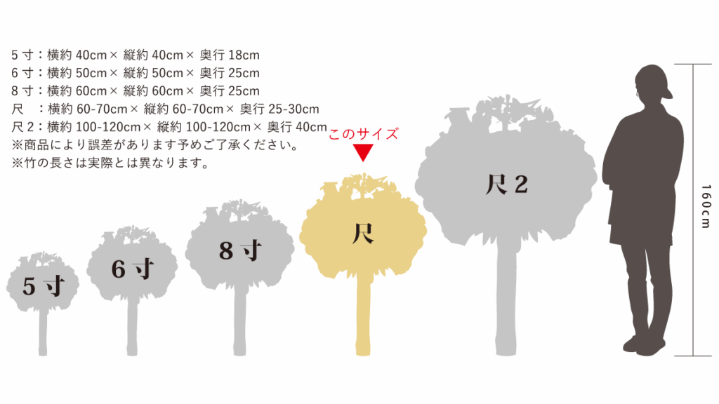 | 注意事項 | ※手作りのため、数センチ程度の誤差が生じる場合がございます。 ※サイズは竹を除く本体部分のサイズとなります。 ※竹がついた状態でお届けいたします。 ※デザインやパーツは異なる場合がございます。 |